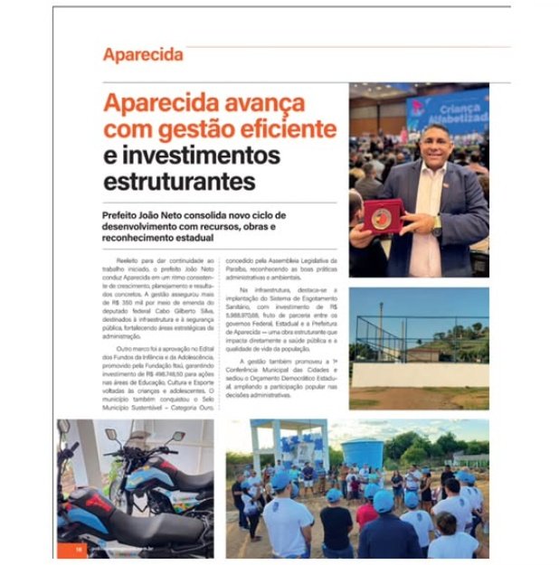 A publicação destaca que a gestão do prefeito João Neto vem consolidando um novo ciclo de desenvolvimento, marcado pela captação de recursos, realização de obras importantes e investimentos em áreas essenciais como infraestrutura, saúde, educação, segurança, esporte, cultura, agricultura e assistência social.