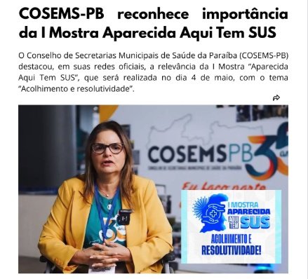 O Conselho de Secretarias Municipais de Saúde da Paraíba destacou, em suas redes sociais oficiais, a realização da I Mostra “Aparecida Aqui Tem SUS”, programada para o dia 4 de maio, no município de Aparecida. O evento terá como tema “Acolhimento e resolutividade”.