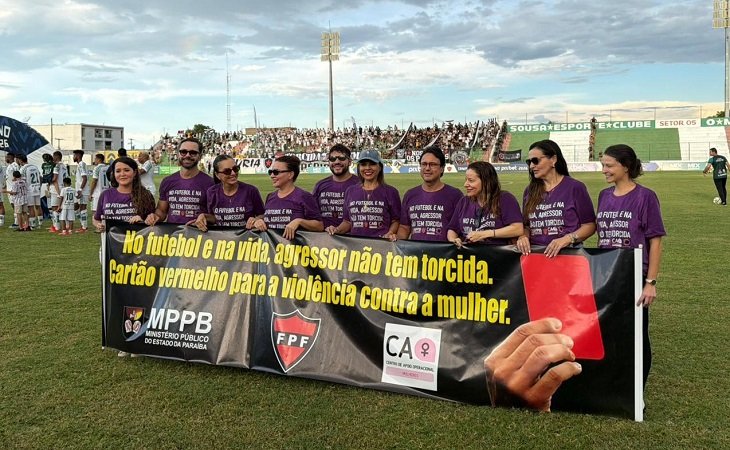 O Marizão, em Sousa, local da primeira partida das finais do Campeonato Paraibano de Futebol de 2026 entre Sousa e Botafogo, neste domingo (15), foi também cenário de uma importante iniciativa de combate à violência contra a mulher. O Ministério Público da Paraíba levou para o estádio a campanha “No futebol e na vida, agressor não tem torcida. Cartão vermelho para a violência contra a mulher.”
