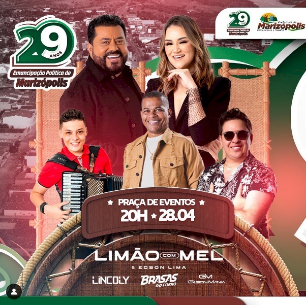 Em comemoração ao 29° Aniversário da cidade, a Gestão Compromisso e Trabalho, coordenada pelo prefeito Lucas Braga, trará para todos, uma grande festa no dia 28 de abril, a partir das 20:00 horas, com as seguintes atrações: Limão com Mel & Edson Lima; Brasas do Forró; Gilson Mania e Lincoly.