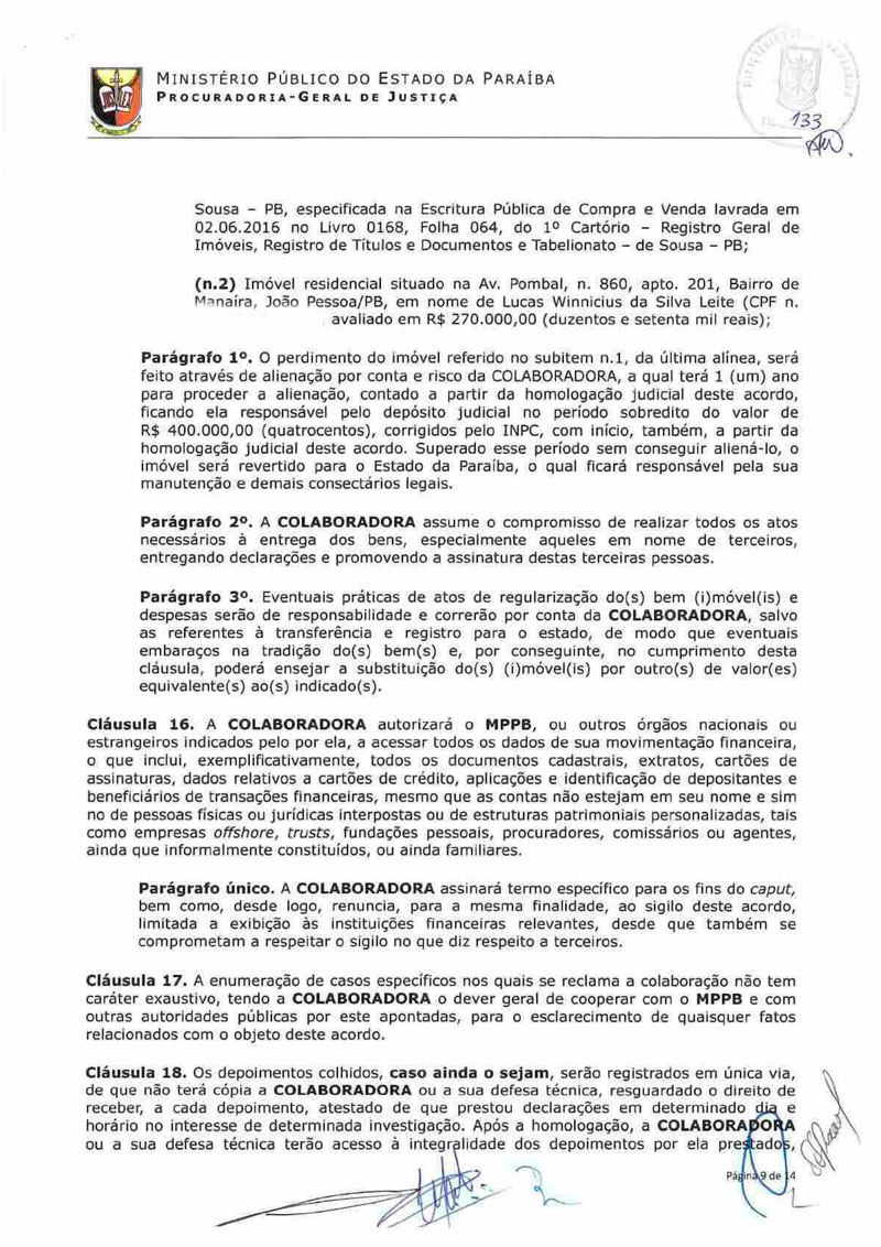 O documento revela termos do acordo entre o Ministério Pública, e a investigada que inclui uma condenação, espécie de “premio” de oito anos, cumprimento em casa, usando tornoseleira, além de perdão para o ex-marido, Elves Rodrigues, e Maria Aparecida Estrela, personagens da compra de uma casa no Município de Sousa.