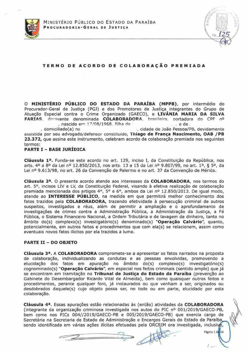 Mais um documento referente a delação premiada feita pela ex-secretária de administração da Paraíba, Livânia Farias, envolvida no “esquema de corrupção”, desvios de recursos financeiro da saúde e educação do Estado no governo de Ricardo Coutinho.