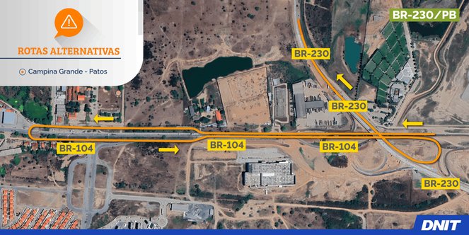Para quem segue no sentido Campina Grande (Av. Assis Chateaubriand) em direção a Patos, o trajeto mudou. Devido ao bloqueio, os motoristas devem continuar pela BR-104 até o retorno do Condomínio Aluízio Campos. Após o retorno, é necessário acessar a alça de subida do viaduto para retomar a viagem rumo ao Sertão paraibano.