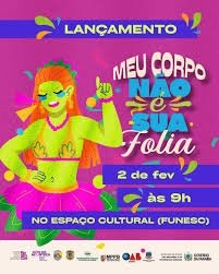 A oitava edição da campanha “Meu Corpo Não é Sua Folia”, iniciativa que tem como objetivo o enfrentamento do crime de importunação sexual e conscientizar a sociedade sobre a importância do respeito ao corpo da mulher, será lançada nesta segunda-feira (2), às 9h, no auditório 1 da Fundação Espaço Cultural da Paraíba (Funesc). De acordo com a Lei nº 13.718/2018, o crime de importunação sexual prevê pena de um a cinco anos de prisão.