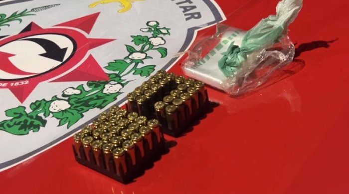 Equipes do comando do 1º Batalhão e da Força Tática apreenderam quarenta e seis munições de calibre 40 com um acusado que já responde por tráfico de drogas e porte ilegal de arma.