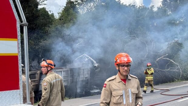 O Corpo de Bombeiros foi acionado e conseguiu conter as chamas. O caminhão ficou completamente destruído. O estado de saúde do motorista é considerado grave.