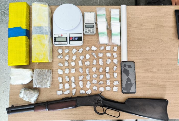 O suspeito foi preso neste sábado (18) com um rifle, mais de 4 kg de maconha, balanças de precisão e embalagens para entorpecentes.