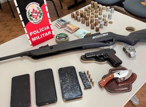 Com base nas informações colhidas, os policiais intensificaram as buscas e localizaram os suspeitos em uma residência no centro da cidade, onde foi efetuada a prisão em flagrante. No local, também foram encontrados R$ 479,00 em cédulas, R$ 88,45 em moedas, três celulares, uma espingarda de seta calibre 5.5, uma pistola calibre 6.35 sem numeração aparente, além de outros materiais relacionados ao crime.