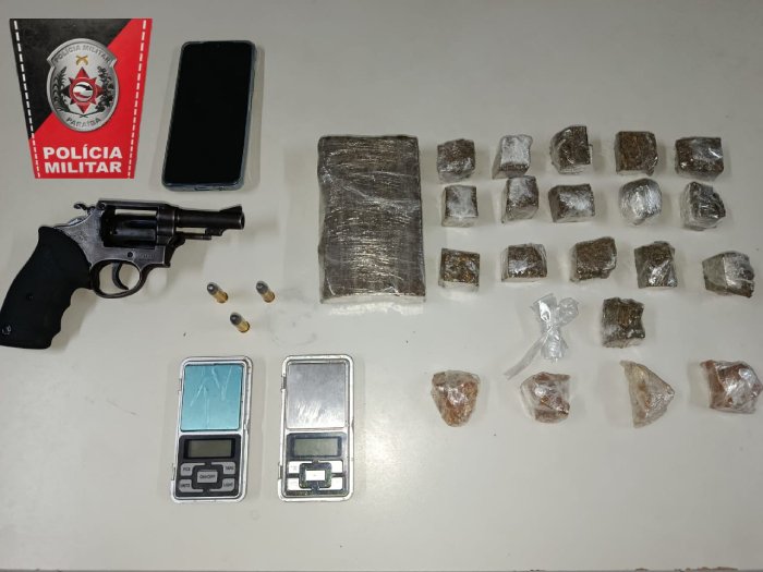 Com ele, foi apreendido um revólver, um celular roubado, uma moto, balanças de precisão e drogas dos tipos crack e maconha.