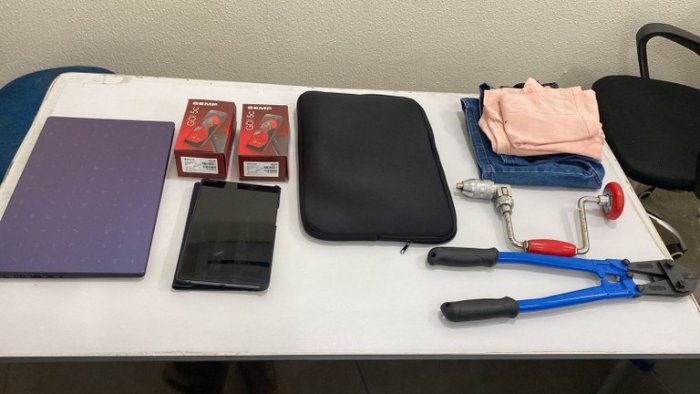 Durante o cumprimento dos mandados, foram apreendidos materiais utilizados nos arrombamentos, produtos furtados e as roupas usadas nas ações criminosas. Uma mulher de 32 anos foi presa em flagrante por esconder o veículo empregado nos crimes e por manter em sua posse parte dos materiais apreendidos. Ela é suspeita de integrar o grupo criminoso, atuando como receptadora. Uma segunda suspeita permanece foragida. A Polícia Civil segue com diligências para localizá-la e cumprir sua prisão.
