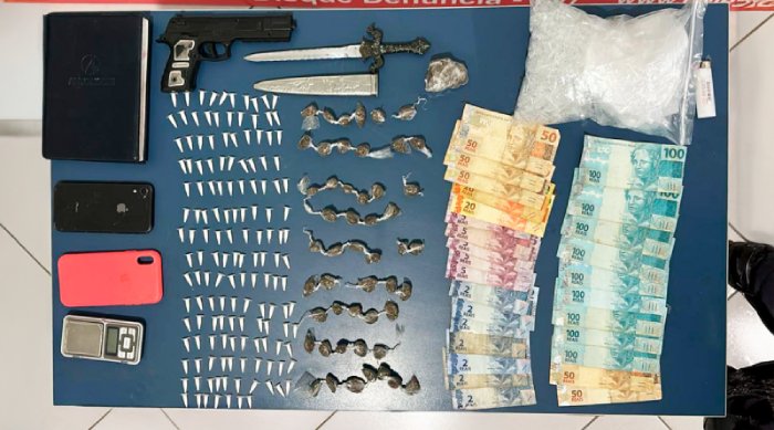 Com os suspeitos, os militares localizaram invólucros de maconha e cocaína, além de uma balança de precisão, um simulacro de pistola, faca, dinheiro e diversos materiais utilizados para embalagem de drogas, caracterizando o tráfico de drogas no local.