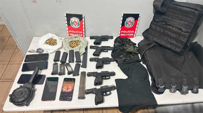 Na abordagem, foram localizadas diversas armas e equipamentos em poder dos cinco suspeitos, sendo apreendidos: 03 pistolas, calibre 9mm, 02 pistolas, calibre .380, 10 carregadores, sendo 02 alongados, 01 carregador do tipo caracol, 03 capas de colete, 02 balaclavas, 139 munições, calibre 9mm e 134 munições, calibre .380.