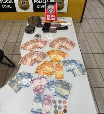 A Polícia Militar, através do 12º Batalhão, prendeu um indivíduo e apreendeu 2 pedras de crack, 7 papelotes contendo substância análoga à cocaína e 1 porção e 2 cigarros de substância semelhante à maconha, além de 5 aves silvestres e R$ 550 em espécie.