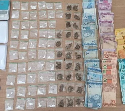 Durante buscas, foram encontradas diversas substâncias entorpecentes, dentre elas maconha e cocaína, além de balança de precisão, embalagens para acondicionamento do material ilícito e uma quantia em dinheiro, caracterizando indícios de tráfico de drogas.