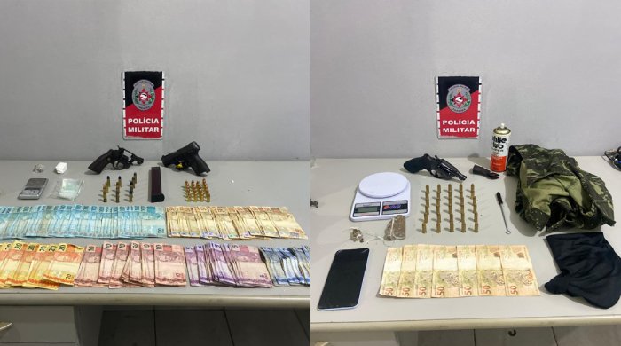 Já nesta madrugada, a equipe interceptou três suspeitos, um adolescente, de 15 anos, e dois homens no bairro do Onze, que ao perceberem a presença policial, tentaram fugir e se desfazer do material, porém foram alcançados. Na ação, foram apreendidas duas armas de fogo, sendo uma pistola, com carregador alongado, um revólver, calibre 38, munições, drogas e uma balança de precisão.
