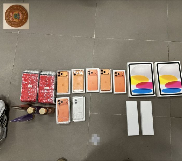 Entre os bens apreendidos estão 10 smartphones, 4 tablets, 2 smartwatches e 5 caixas de celulares sem aparelho. Além disso, havia também 120 frascos de um produto cosmético importado.