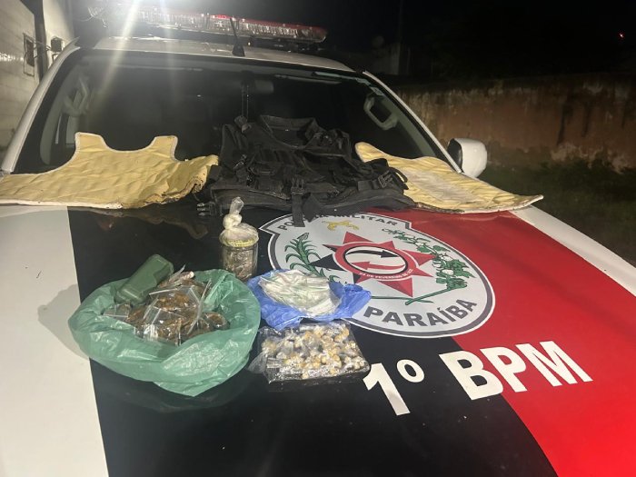 Policiais do 1º Batalhão apreenderam drogas e colete balístico, durante operação realizada na noite dessa sexta-feira (20), na comunidade Riachinho, no bairro Treze de Maio, em João Pessoa.