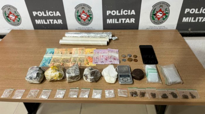 Na abordagem, foram encontradas drogas, como: maconha e cocaína, além de uma balança de precisão e dinheiro, em espécie.