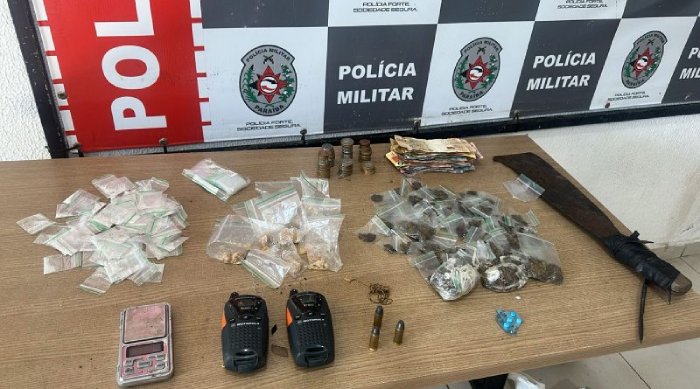 No local foram encontradas várias porções de maconha e crack. Também foram encontrados uma balança de precisão, três munições, calibre .45, dois rádios comunicadores, colares, bolsas, um facão, dinheiro e materiais urilizados para o acondicionamento da droga.