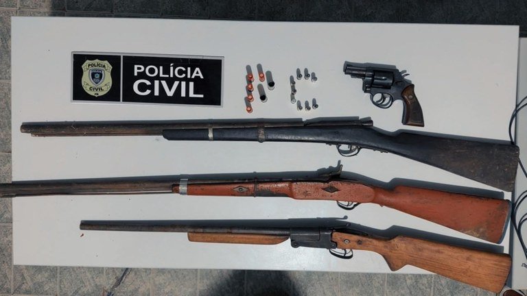 No decorrer das diligências, após a confirmação da denúncia, o investigado foi localizado em sua residência, onde foram encontradas três espingardas e um revólver calibre .38. O material apreendido foi encaminhado para os procedimentos legais cabíveis. Diante da situação de flagrante, o suspeito foi conduzido à unidade policial, onde foram adotadas as medidas cabíveis, permanecendo à disposição da Justiça.