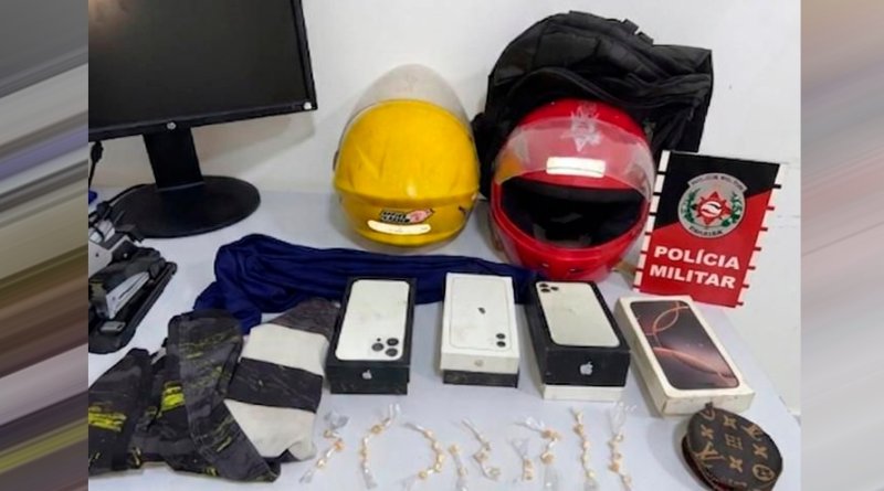 Durante as buscas, o veículo foi localizado em frente a uma residência. Dois suspeitos tentaram se abrigar no imóvel, sendo imediatamente abordados. No local, foram encontradas vestimentas e uma mochila compatíveis com as utilizadas no crime. Com a confirmação da participação no roubo, os adolescentes indicaram que os objetos subtraídos estariam em um imóvel vizinho. No imóvel, as equipes encontraram vários aparelhos celulares, os capacetes utilizados no assalto, além de 39 porções de crack.