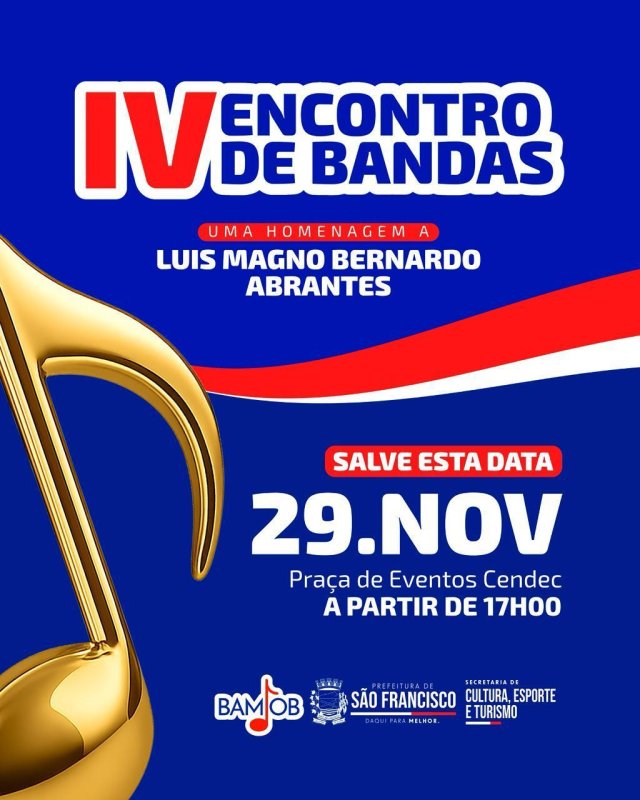 A cidade de São Francisco, no Sertão paraibano, realiza neste sábado (29) o IV Encontro de Bandas, reunindo 12 bandas de música de diferentes municípios da região. O evento está marcado para começar às 17h, na Praça de Eventos Cendec.