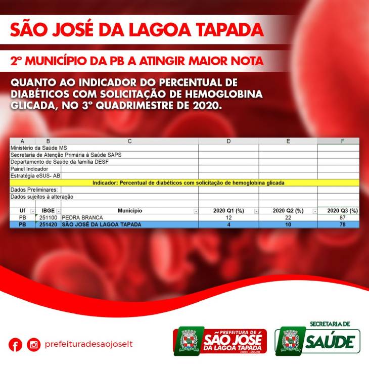 São José da Laoa Tapada ficou em toda a Paraíba apenas a atrás da Cidade de Pedra Branca que atingiu pontuação de 87, enquanto o Município sertanejo, cravou o número 78, o que foi muito comemorado pelo Prefeito Claudio Antônio que está atendo aos serviços oferecidos pela Saúde a toda a população.