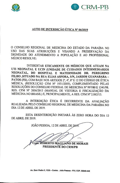 A interdição ética dos médicos, passa pelo setor de neonatal do Hospital. Foi constatado, após denúncia recebida pelo CRM, faltas de insumos básicos, exames e medicamentos.