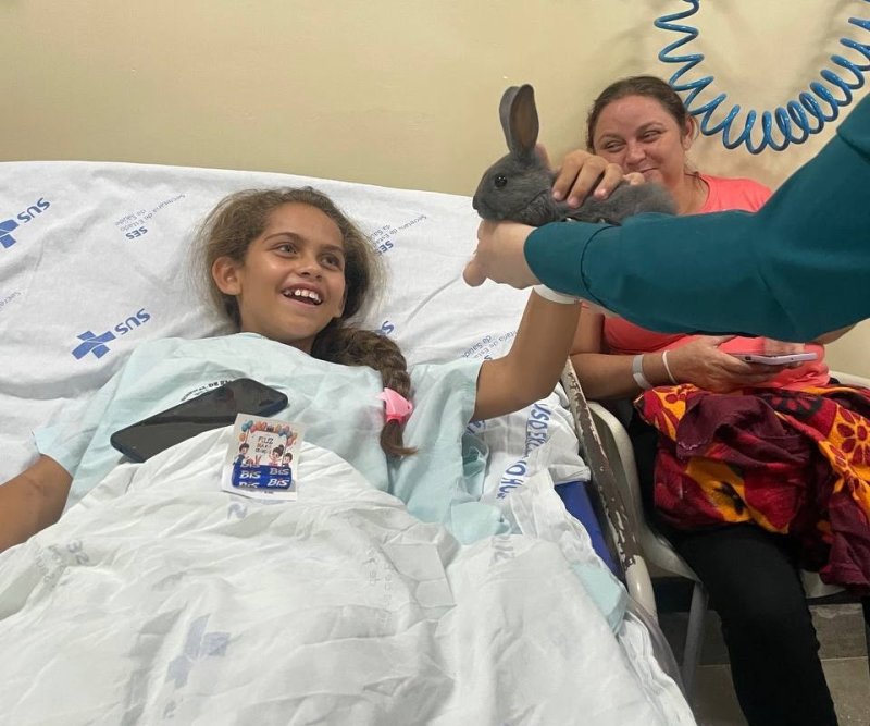 Já nesta quarta-feira (8), as crianças receberam uma visita pra lá de especial: lindos coelhinhos, que arrancaram sorrisos e despertaram a curiosidade dos meninos e meninas internados na unidade. O pequeno João se encantou com o amiguinho peludo. Ele disse que nunca tinha visto um coelho de verdade e nem tocado. “Achei muito legal, conhecer o coelhinho de verdade. Eu alisei ele e não fez nada comigo”, disse.
