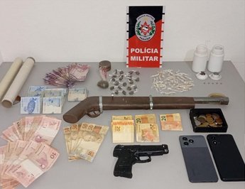 Durante a varredura, os militares localizaram uma espingarda calibre 12, de fabricação artesanal, uma pistola simulacro, além de substâncias entorpecentes análogas a maconha, cocaína e crack, embaladas e prontas para comercialização. Também foram apreendidos R$ 1.553,70 em espécie, balanças de precisão, embalagens plásticas e outros materiais comumente utilizados no tráfico de drogas.
