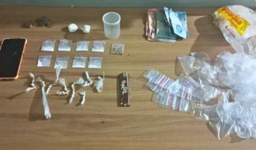 Durante a abordagem, os policiais encontraram porções de cocaína, crack, sementes de maconha, dinheiro em espécie e embalagens plásticas, escondidos próximo a uma árvore em um local conhecido por ser ponto de tráfico.
