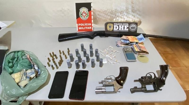 As equipes policiais realizaram uma operação e prenderam os dois suspeitos em uma residência no bairro Liberdade. A ação resultou na apreensão de 01 espingarda, calibre 12, 02 revólveres, calibre 38, munições, 21 pedras de crack, 01 papelote de cocaína, 01 balança de precisão, celulares e dinheiro, em espécie.