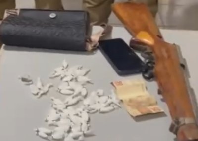 Uma busca realizada no interior do veículo resultou na apreensão de uma Espingarda calibre 12 e de 50 invólucros de Cocaína.