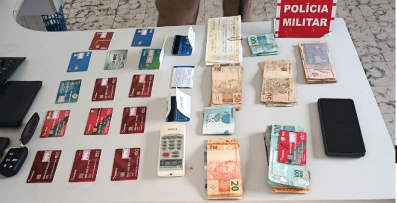 Ao chegar ao local, os policiais militares flagraram o suspeito efetuando um saque de R$ 1.530,00 usando o cartão bancário de uma senhora. O documento foi imediatamente apreendido. Durante a abordagem, a equipe encontrou 18 cartões bancários de diversas instituições e R$ 6.148,00 em espécie.