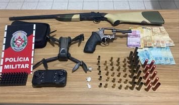 Durante a ação, o adolescente foi flagrado em posse de substâncias entorpecentes e uma arma de fogo. Em continuidade à ocorrência, após busca realizada no local, foram apreendidos ainda uma espingarda, mais substâncias análogas a drogas , dinheiro e até um drone.