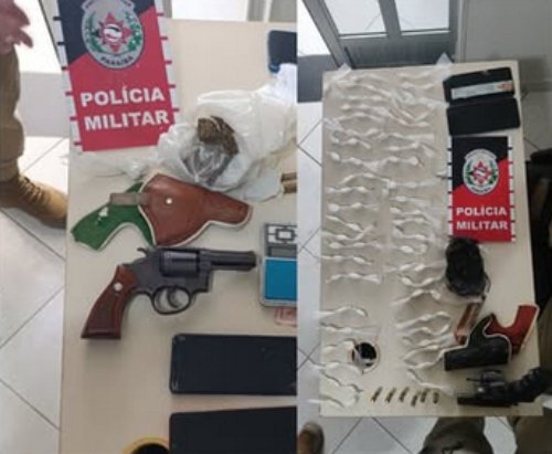 Durante as diligências no imóvel alvo da ação, os policiais localizaram e apreenderam um revólver calibre .38, quatro munições intactas, uma quantia em dinheiro trocado e uma porção de substância análoga à maconha. Todo o material foi recolhido no local, reforçando a suspeita de prática criminosa.