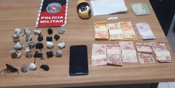 Durante a varredura, os policiais localizaram 24 porções de substância análoga à maconha, além de dinheiro em espécie, um aparelho celular e uma câmera de monitoramento — equipamento comumente utilizado pelo tráfico para vigiar a chegada das forças de segurança.