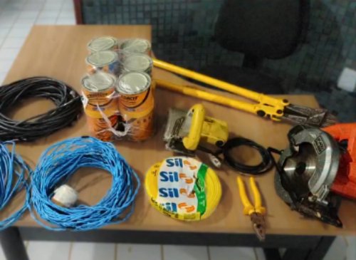 Durante a abordagem, o suposto acusado declarou que os objetos furtados estavam na residência de seu primo. A guarnição conduziu o indivíduo até o referido endereço, onde foram recuperados os materiais subtraídos, a saber: 01 rolo de fio, 01 caixa de compoud, 02 extensões, 01 tesoura, 01 maquita, 01 serra circular para corte de madeira.