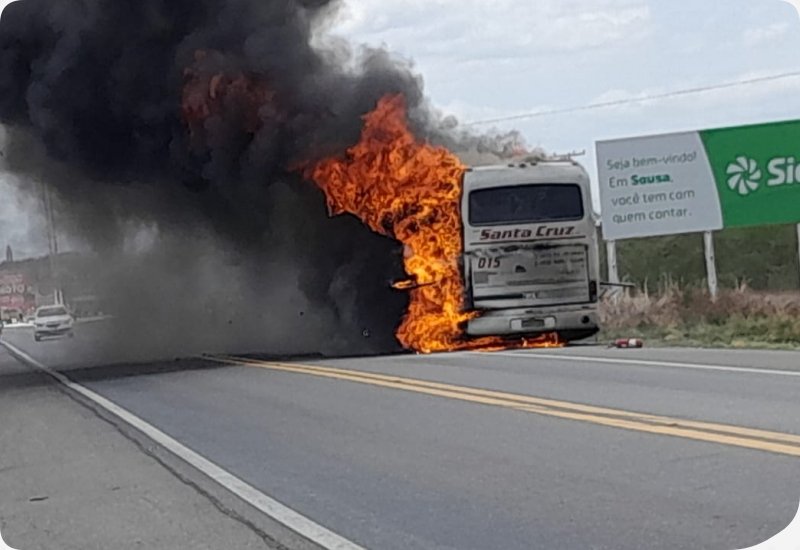 Um ônibus da empresa Santa Cruz, que faz a linha Sousa–Santa Cruz, pegou fogo no início da tarde desta segunda-feira (19), às margens da BR-230, na saída de Sousa em direção ao município de Aparecida, no Sertão da Paraíba.