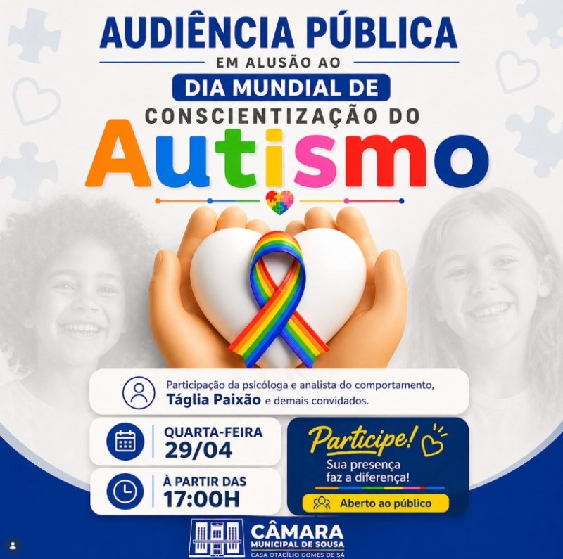 A Câmara Municipal de Sousa realizará uma audiência pública em alusão ao Dia Mundial de Conscientização do Autismo, com o objetivo de ampliar o debate sobre inclusão e políticas públicas voltadas às pessoas com Transtorno do Espectro Autista (TEA).